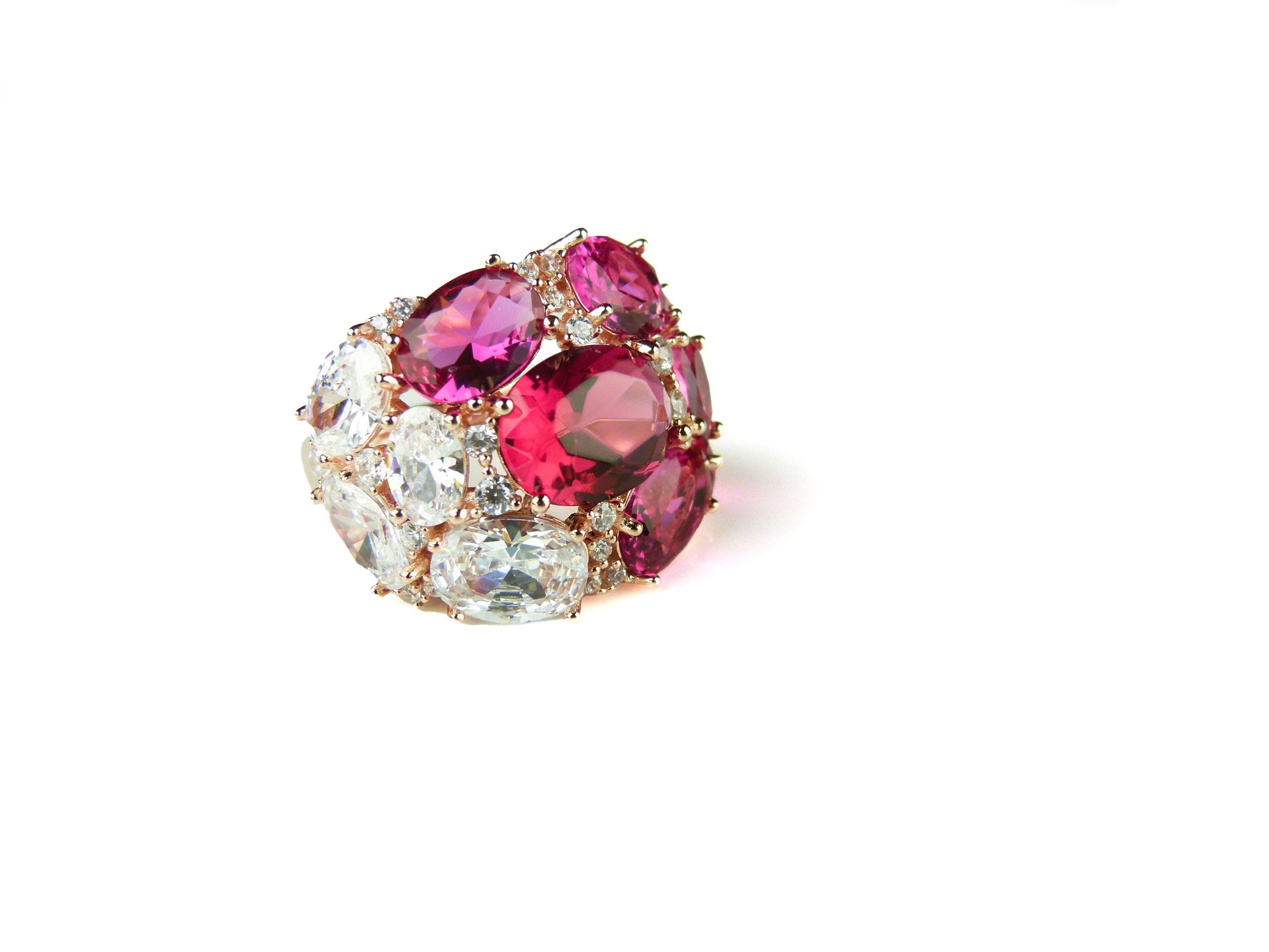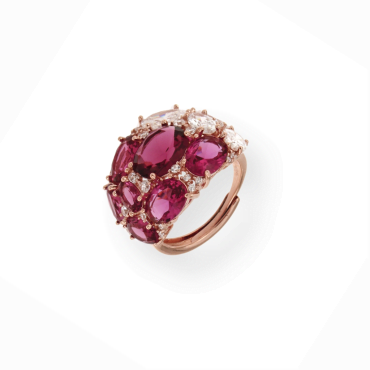 Brede zilveren ring roos goud verguld gezet met roze rode en witte stenen